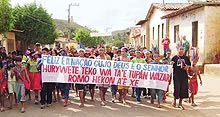 na entrada da aldeia. Dois deles desenrolam uma faixa na qual se lê