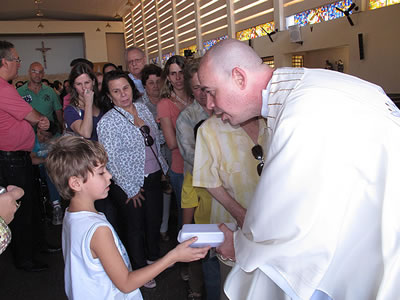 fiéis com o presente do menino nas mãos.