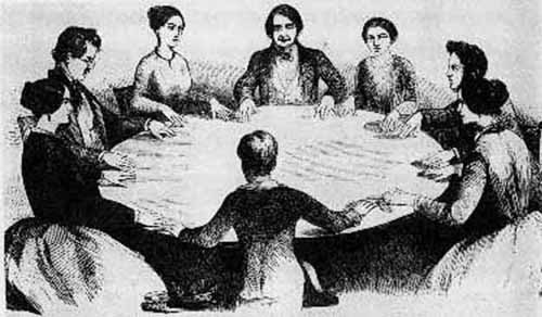 por médiuns — pessoas com o suposto dom de comunicação