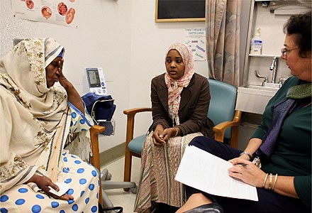 paciente somali(esq.) ajudada por intérprete