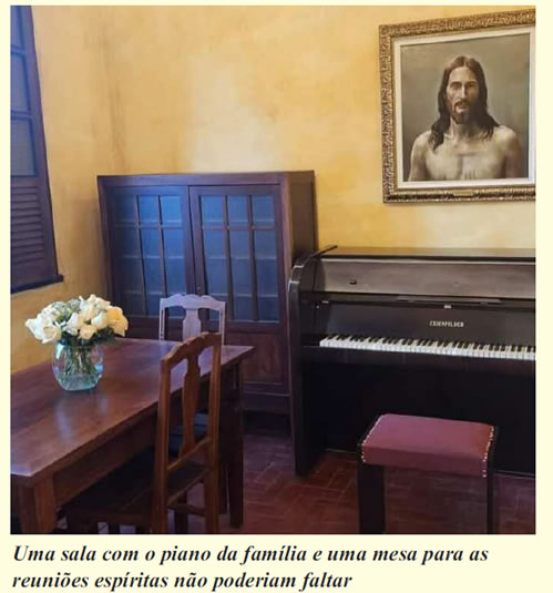 com o piano da família e uma mesa para as reuniões espíritas,